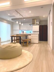 キッチン・リビング・ダイニングを一体化させたことで、光と風が抜ける明るく開放的な空間が誕生しました。